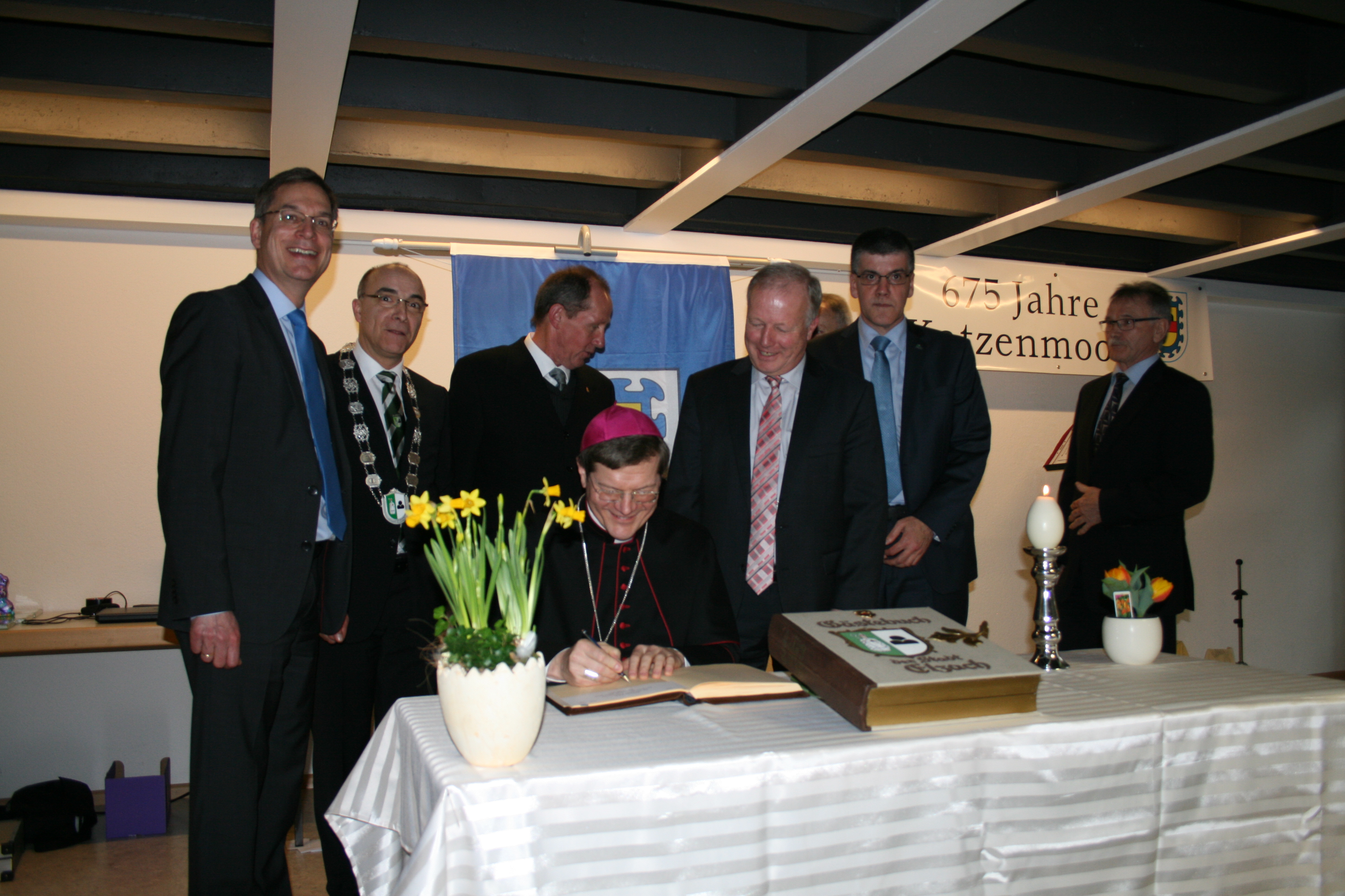 Groß war die Gratulantenschar anlässlich der 675-Jahrfeier von Katzenmoos am Ostermontag 28.03.2016. Neben Bürgermeister Roland Tibi waren Landrat Hanno Hurth, MdB Peter Weis, die Bürgermeister Ruf, Hämmerle und Singler sowie Dekan Hans-Jürgen Decker und Hörnlebergpfarrer Bernhard Thum gerne der Einladung von Ortsvorsteher Franz Lupfer gefolgt, um dieses Jubiläum gemeinsam zu feiern. Besonders erfreut war man über die Anwesenheit des Freiburger Erzbischofs Stephan Burger, dessen familiäre Wurzeln bekanntlich in Katzenmoos liegen.