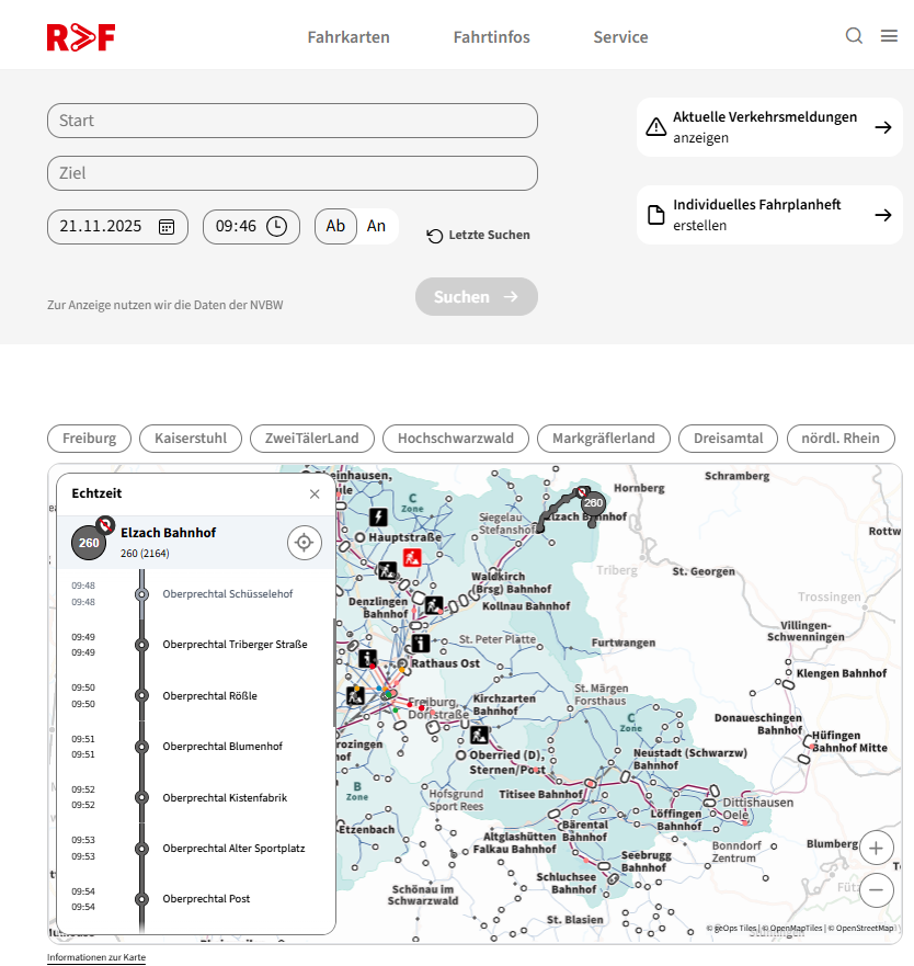 Die interaktive Karte wurde als Pilotprojekt in Deutschland zwischen der GeOps AG aus der Schweiz und dem Regio-Verkehrsverbund Freiburg entwickelt. Dieser vernetzt nachhaltige Mobilität in den Landkreisen Emmendingen, Breisgau-Hochschwarzwald und in der Stadt Freiburg. Angefangen bei Bus und Bahn über Sharing-Optionen wie Frelo bis hin zu digitalen Tools wie FAIRTIQ. Unser Ziel ist, dass alle Menschen in der Region einfach und umweltfreundlich von Tür zu Tür kommen. Ohne nachzudenken und egal mit welchem unserer Verbundpartner. Den Aufgabenträgerverbund bilden die Stadt Freiburg gemeinsam mit der Freiburger Verkehrs AG (VAG), die Landkreise Emmendingen und Breisgau-Hochschwarzwald sowie das Land Baden-Württemberg. In deren Auftrag betreiben 15 Verkehrsunternehmen Busse und Bahnen im RVF und befördern im Schnitt rund 100 Mio. Fahrgäste pro Jahr. Über Verbesserungen im Angebot, insbesondere auch für die letzte Meile mit den Sharing-Partnern, soll diese Zahl signifikant gesteigert werden.