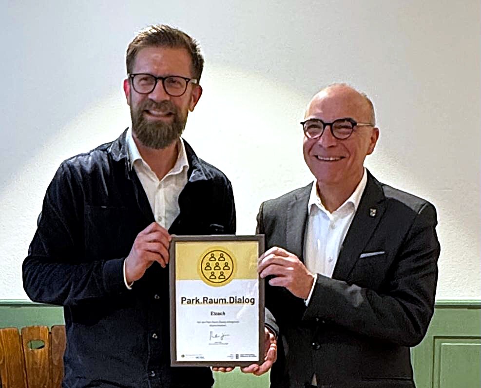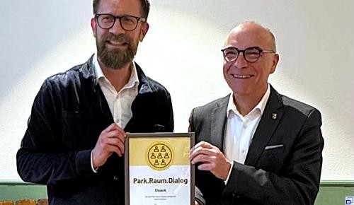 Daniel Voith überreicht die Urkunde des Landes zum Park.Raum.Dialog an Bürgermeister Roland Tibi